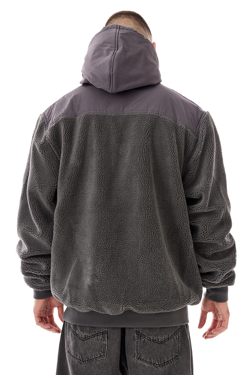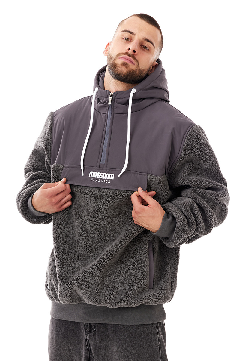 Kurtka Mass Denim Frontside. Kurtka typu anorak, wkładana przez głowę, rozpinana suwakiem do wysokości mostka. Zaopatrzona w kaptur ściągany sznurkiem oraz zapinaną kieszeń na froncie. Dół i kurtki i rękawy wykonane z miękkiego i ciepłego polaru. Całość wykończone elastycznymi ściągaczami. Na froncie aplikacja z nazwą marki w formie haftu.