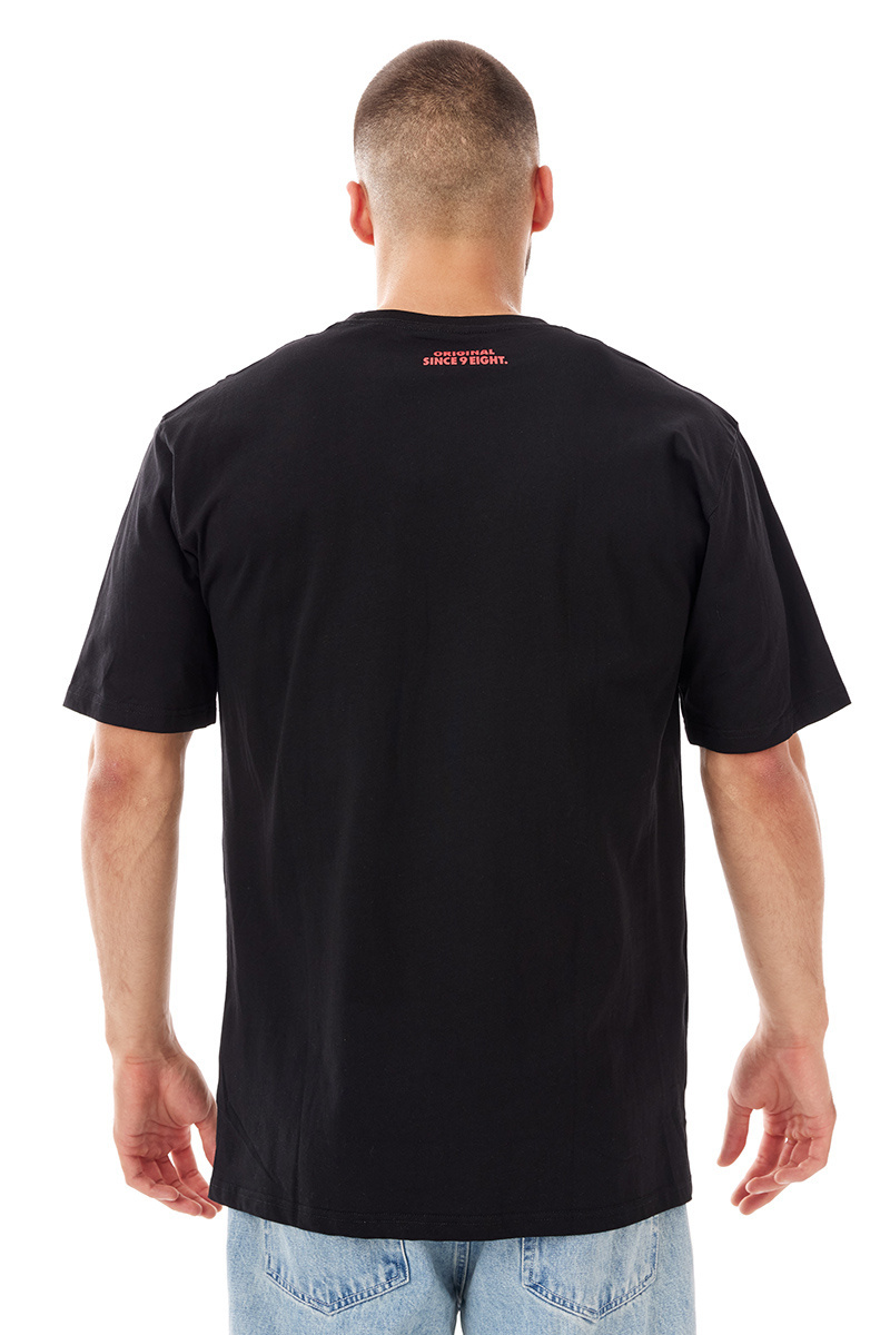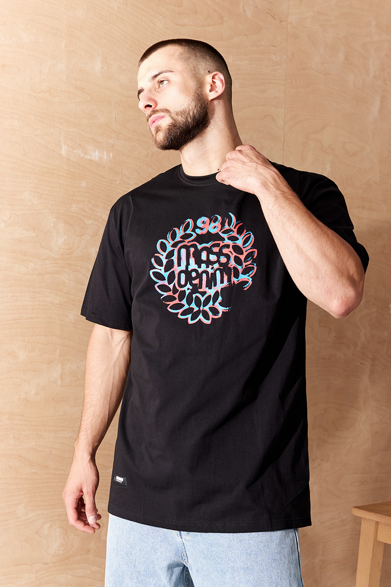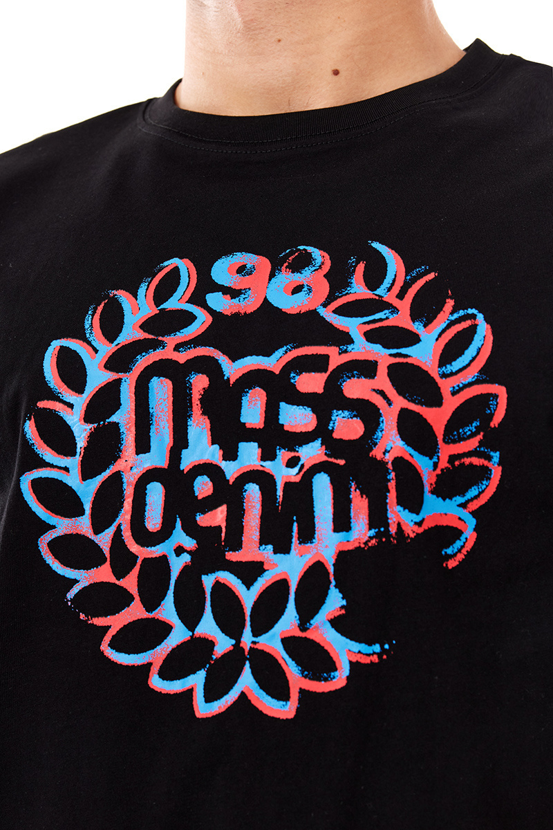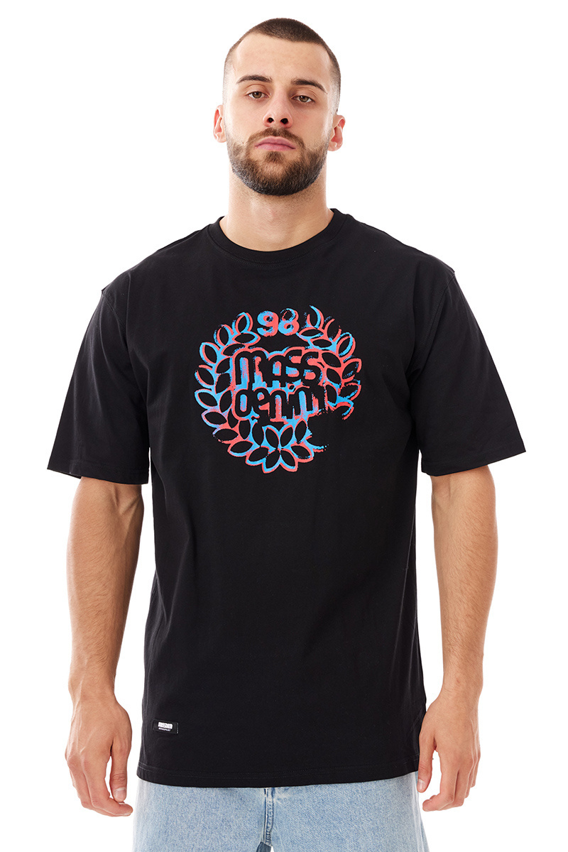 Koszulka Mass Denim Stencil. Na froncie kolorowa, drukowana aplikacja z logotypem marki. Na dole koszulki brandowa wszywka.