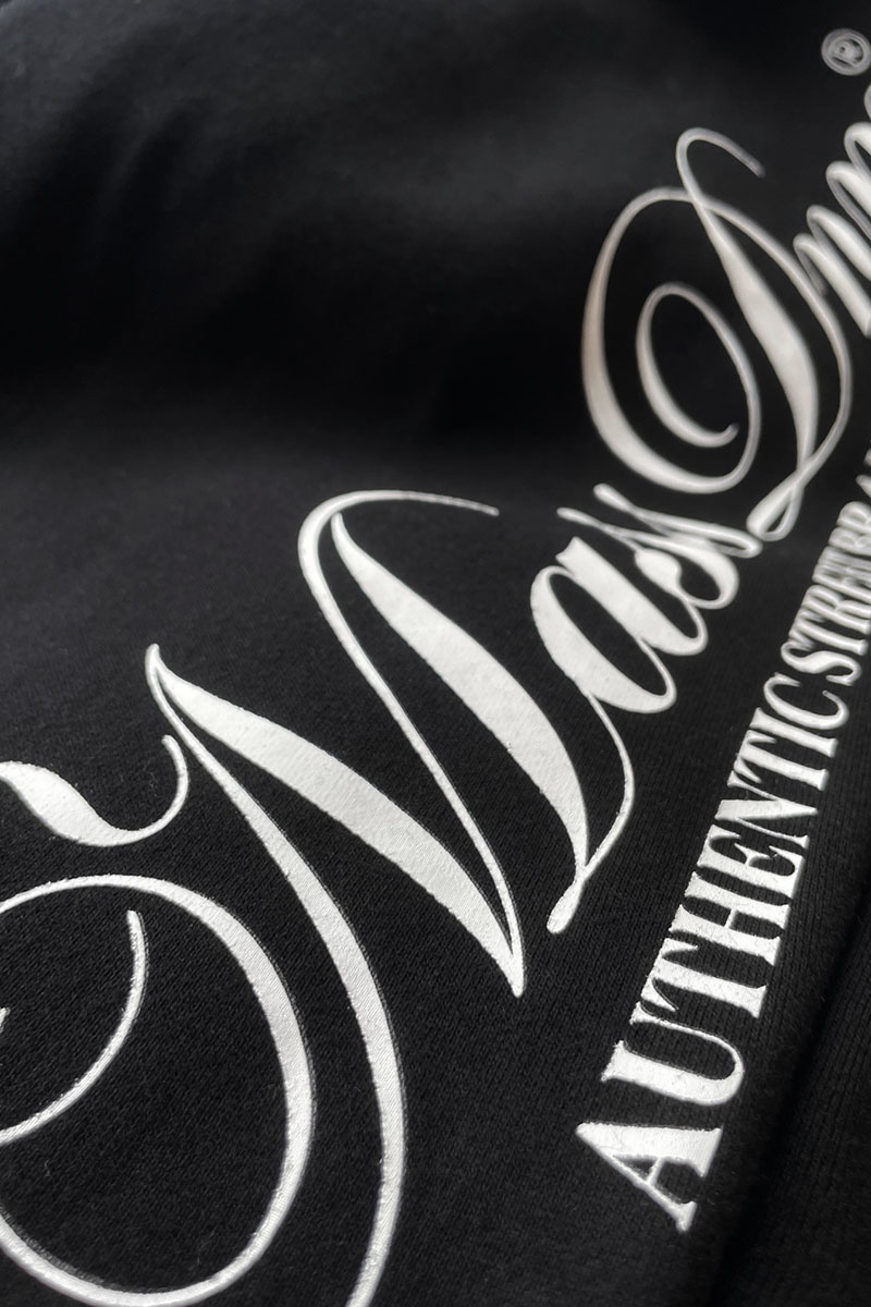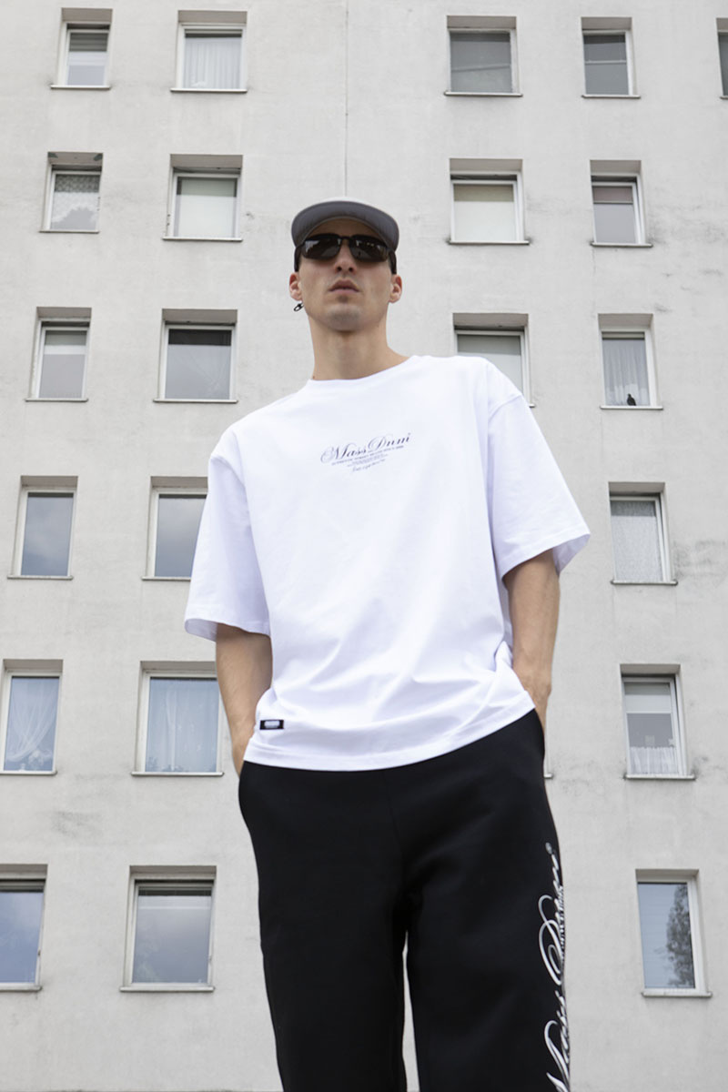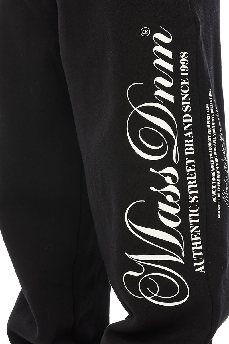Spodnie dresowe Mass Denim Initials. Powiększona i poszerzona wersja dresów typu baggy. W pasie elastyczny ściągacz z wpuszczonym sznurkiem, po bokach wsuwane kieszenie. Na lewej nogawce markowa aplikacja w formie nadruku. Na tylnej kieszonce haft. Nogawki wykończone elastycznymi ściągaczami.